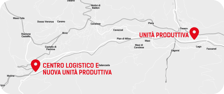 Il nostro stabilimento produttivo principale si trova a Lago di Tesero, a 8 km è situato il centro logistico di Molina di Fiemme, accanto a quest’ultimo è in costruzione un nuovo stabilimento produttivo.
